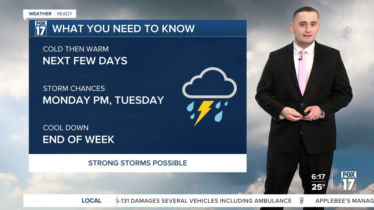 The forecast from FOX 17 Weather Ready Meteorologist Colton Cichoracki: A weak disturbance brought some snow showers to West Michigan last night. A few slick spots will remain on the roads to begin the day. The good news is we will dry out to start the weekend. Saturday's forecast is for mostly sunny to partly cloudy skies. Highs will be in the upper 30s to lower 40s. A warm-up is set to begin on Sunday thanks to a nice breeze from the southwest. This will boost temperatures into the upper 50s to near 60 degrees on Sunday. The warm-up continues into next week as well as highs reach the upper 60s to near 70 degrees both Monday and Tuesday. Our weather will turn much more active, however, with a chance for showers and storms Monday night into Tuesday. There is also the risk for a few stronger thunderstorms as well.