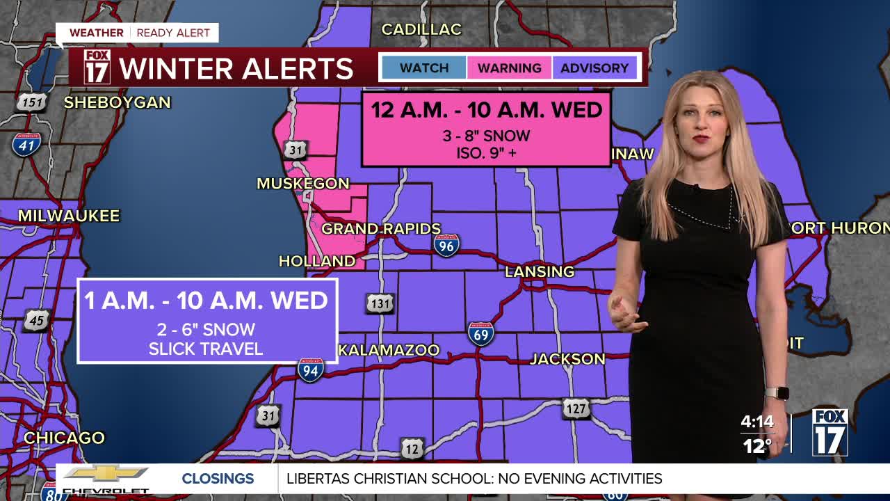 Winter alerts have been issued for all of West Michigan to account for this next system. Most are in a WINTER WEATHER ADVISORY (purple), but Oceana, Muskegon and Ottawa counties are in a WINTER STORM WARNING (pink) for higher amounts of snow. These start between midnight and 1 a.m., and run through 10 a.m. Wednesday.